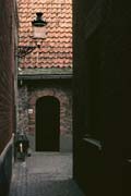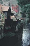 An hour's train ride north and west of Brussells is the medieval town of Brugge. This is an ancient trading city a few miles insland from the North Sea. The town is largely untoiched from its heyday of a few centuries ago, and is crisscrossed by many small canals. Today, Brugge is a university town as well as a tourist stop, though I find the quiet pace and smaller, more leisurely tourist scene more attractive than the noisy, crowded bustle of, say, Venice. This is one of the many little canals, located near the University. This picture was taken in early November of 1979.