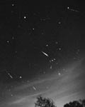 At about 4:30 on a very cold November morning, I opened the shutter on my Nikon F3 point for 30 seconds. The camera was pointed south and slightly west. Meteors were sreaming through the sky aometimes at the rate of once every 10 seconds or so, but this was the only shot to have captured 4 distinct meteors in it. All other had only 1 or maybe 2. Indeed, this image is just the rightmost 50% of the total frame