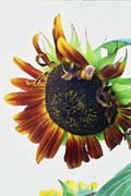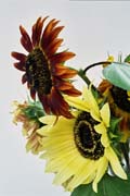 These two images are of a collection of sunflowers that arrived along with some party guests one Sunday. I shot these to illustrate the issues of depth of field, lighting and exposure, leaving the composition somewhat (but not entirely) to chance. To ensure as great a depth of field, I used a very small aperture, f/22 or smaller. And because the illumination was principally from sunlight reflected off clouds to the north, the light, while superbly soft, was not very bright. This resulted in quite long exposures, on the order of 2-6 seconds. And because they were shot outside, motion due to wind was an issue. In such cases, patience is required. A plain white background was used: nothing more complicated than a sheet of foamcore, with more foamcore panels used to provide small amounts of fill lighting for what few shadows remained.